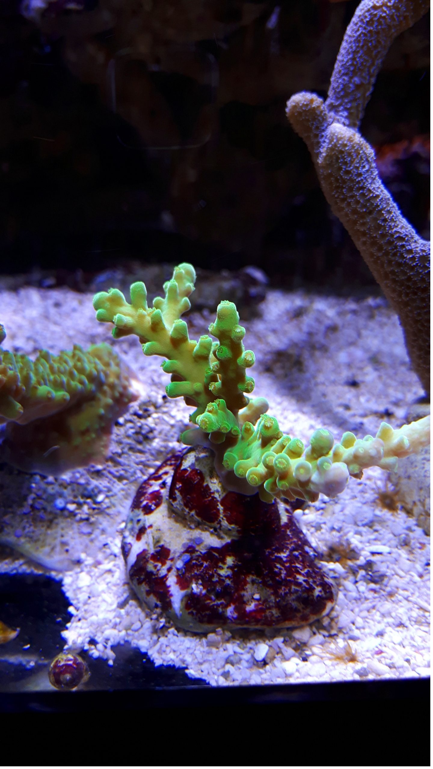 Acropora spp. green zaliczana jest do rodziny koralowców twardych mało polipowych (SPS).