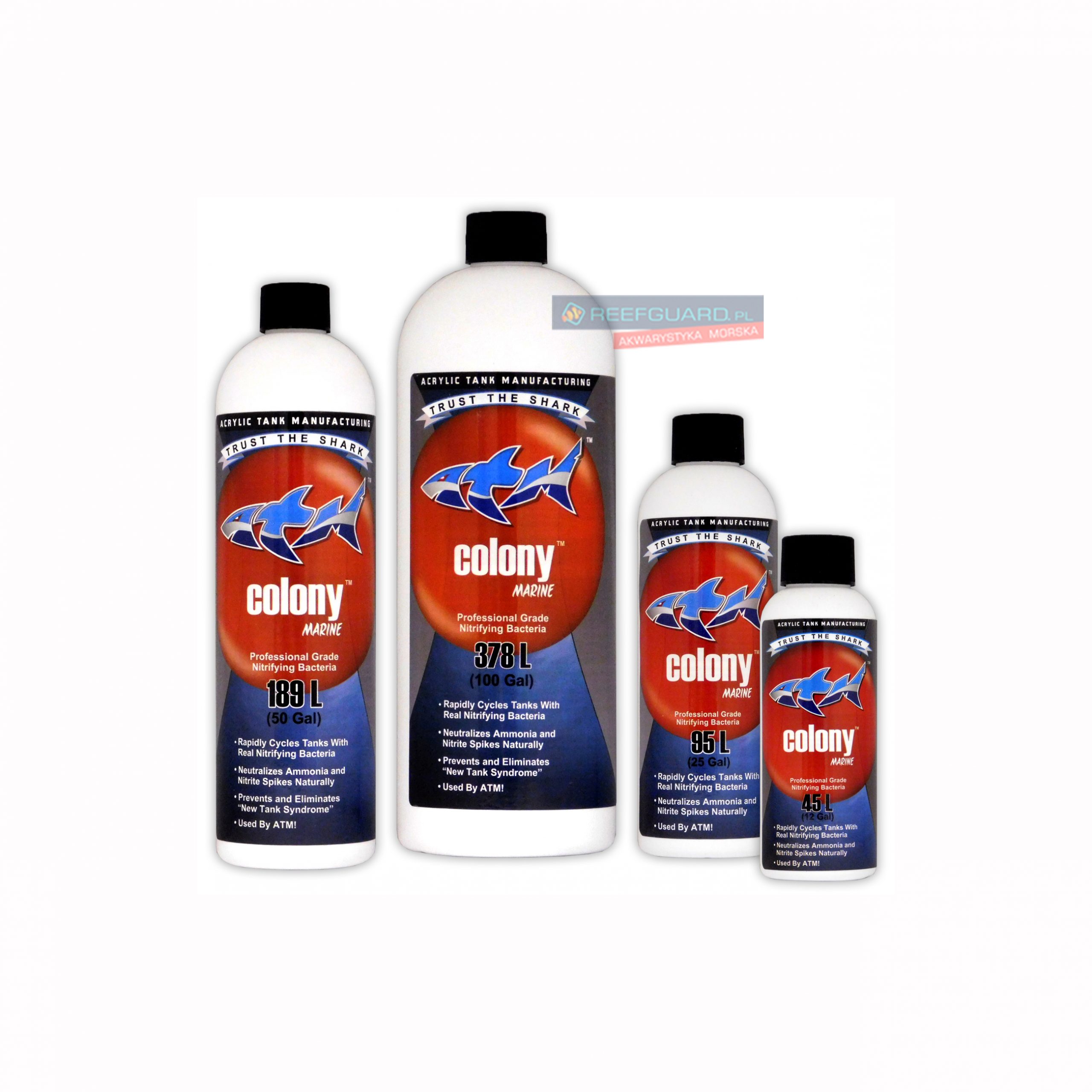 W Reefguard.pl już dostępne, jedyne w swoim rodzaju bakterie nitryfikacyjne COLONY Marine firmy ATM (Acrylic Tank Manufacturing) twórców między innymi programu „Tanked” na kanale Animal Planet. ATM COLONY stabilizuje biofiltrację zbiornika morskiego w kilka dni od jego założenia. Już po tygodniu od zalania akwarium świeżo zasoloną wodzą RO i dodaniem do niej ATM COLONY, z pełnym poczuciem bezpieczeństwa możemy zacząć jego zasiedlanie rybami, koralowcami oraz innymi bezkręgowcami morskimi. Jest to najszybsza metoda startu zbiornika morskiego – w przeciwieństwie do innych systemów w których zajmuje to miesiące. Jedyne bakterie stosowane w profesjonalnych ośrodkach takich jak oceanaria.
