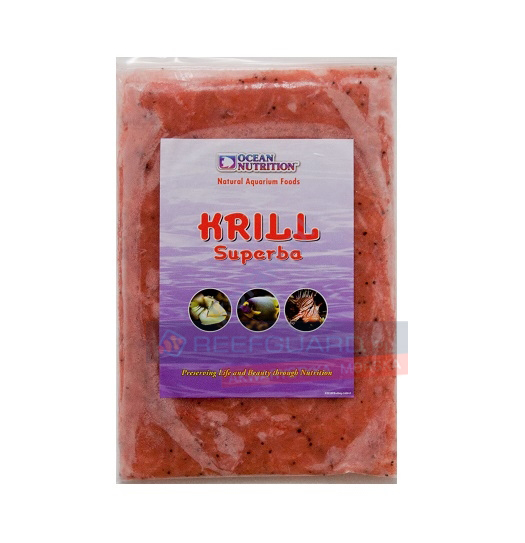 Krill Superba Whole 454g Ocean Nutrition cały kryl antarktyczny (Euphausia superba) to krewetkopodobny bezkręgowiec, poławiany w czystych, zimnych wodach Antarktyki. Osiąga do 5 cm długości i jest bogaty w białko, kwasy tłuszczowe omega-3 oraz naturalne barwniki (karotenoidy), wspomagające wybarwienie ryb.